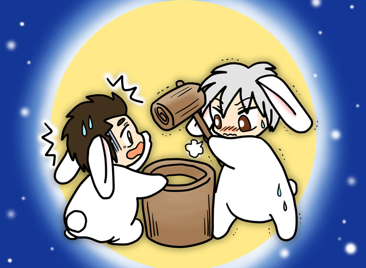 ウサ郷さんとウサしげるは、月でお餅つきをします。